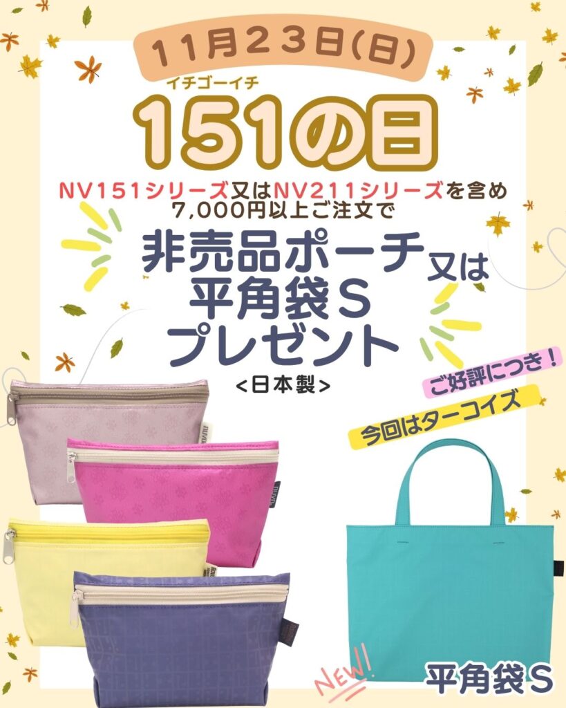 2020年4月4日 / 最終更新日時 : 2020年5月22日 軽いバッグのヤマト屋 メールマガジン4/4 メールマガジン『特製ポーチをプレゼント4月5日 NV151の日/安心・安全を考えたバッグ』 4月5日(日)NV151の日に『NV151シリーズ』を 7,000円(税込)以上ご購入頂きますと『特製ポーチ』又は『次亜塩素酸水』を1つプレゼントいたします! 20,000円(税込)ご購入で、ポーチをもう一つプレゼントし […]